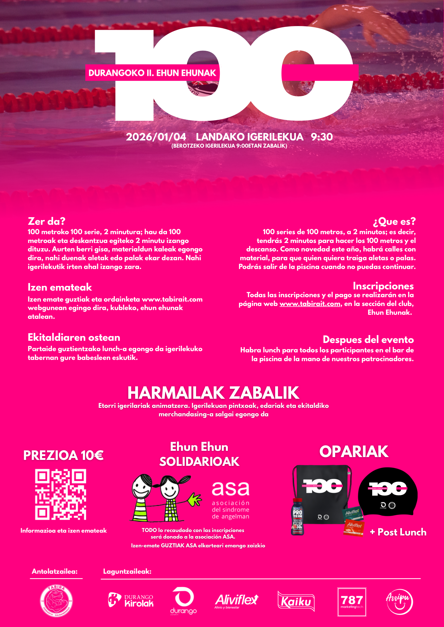 Hitzordua urtarrilaren 4an, larunbata, izango da Durangoko Landako Kiroldegiko igerilekuan. Tabira Igeriketa Taldeak ilusio handiz antolatzen du urteroko ekitaldi hau, urteari hasiera emateko modu ezin hobea baita.